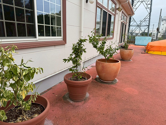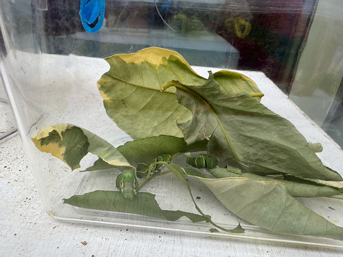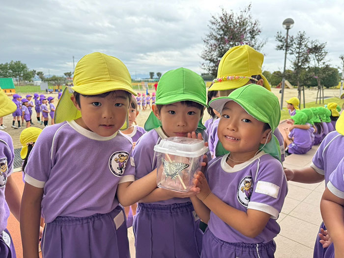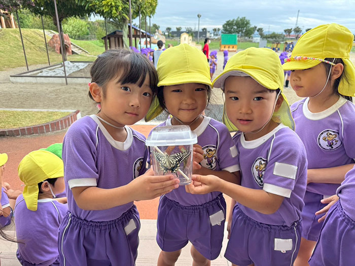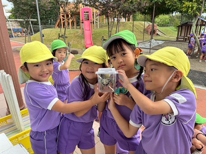 あすかの園庭に仲間入りしたレモンの木から幼虫を捕まえて虫カゴに入れ、餌となる葉っぱをあげたりカゴの掃除をしたりみんなでお世話をしています。