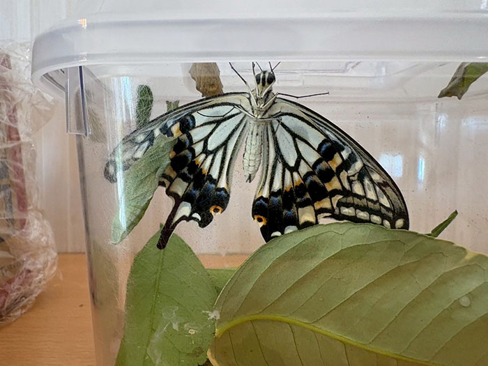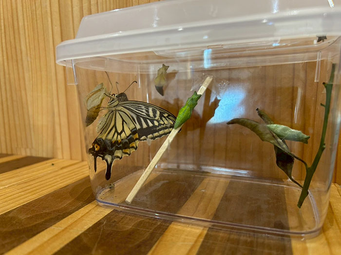 今、あすかではアゲハチョウを幼虫から育てる過程を子どもたちと観察しています。